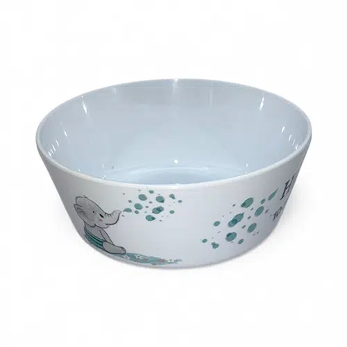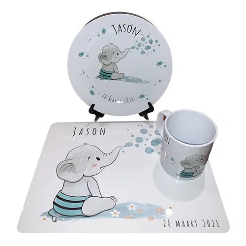 bordje met naam en bellenblaas olifant (uit te breiden met beker, kommetje,placemat en bestek)