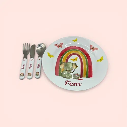 Bordje met regenboog olifant (uit te breiden met beker, kommetje,placemat en bestek)