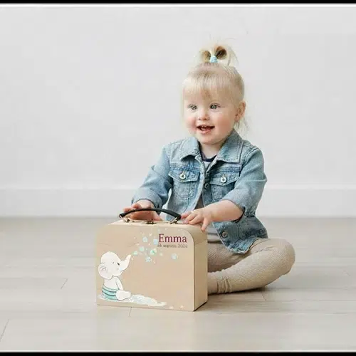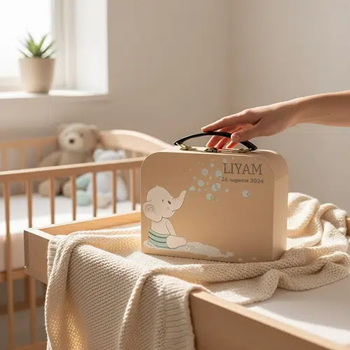 Een lief en persoonlijk houten koffertje, perfect om dierbare babyherinneringen in te bewaren of cadeau te geven.